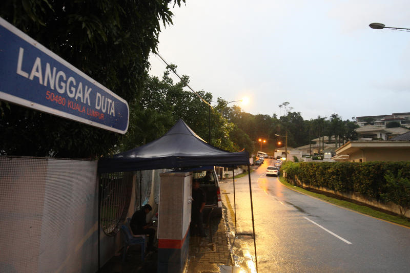 Tinjauan di lokasi sehingga 10 pagi mendapati hanya kelihatan beberapa anggota polis berkawal di lokasi berkenaan. 1952018 Keadaan di sekitar rumah Najib di Jalan Langgak Duta Taman Duta pagi ini.